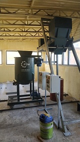 Скиповый подъёмник выполнен из швеллера 12П, имеется электрическая таль с пультом управления дня поднятия скипового бака. Взвешивание происходит при помощи весового датчика фирмы Cas (Ю. Корея). При поднятии скипового бака открывается заслонка, инертные материалы попадают в смеситель активатор. Для дозации воды имеется бак. Для точно измерения кол-ва воды на пульте управления имеется панель, с помощью которой задается нужно количество для набора воды. Дозация происходит при помощи электромагнитного клапана с электрическим счетчиком воды. После набора нужного количества воды, электромагнитная заслонка закрывается.