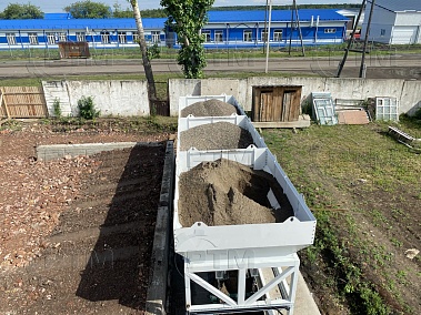 1.     Дозирующий комплекс СТ-40 (2 секции по 20 м3): состоит из двух до четырех бункеров для хранения инертных материалов (щебень, песок, отсев). На каждом бункере имеется два пневмо- затвора, необходимых для точной дозации материалов. При дозировании материалы попадают на весовой ленточный конвейер, весовые датчики фирмы CAS Ю.Корея, при наборе нужного количества материалов, заслонки закрываются, подача прекращается. Объем каждого бункера от 2,5 м3 до 20 м3, в зависимости от комплектации завода. Каждый бункер оснащен вибродвигателем MVE 300/3.