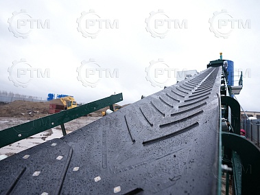 2.      После набора нужного количества материалов инертные попадают на наклонный ленточный конвейер с шевронной лентой. Ширина ленты 600 мм, длинна конвейера 16 метров.