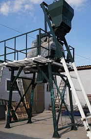 Данный завод состоит из жесткой рамной конструкции, двухвального бетоносмесителя на 750 литров по загрузке, скипового бака с весовой площадкой и лебедки для подъема инертных материалов.