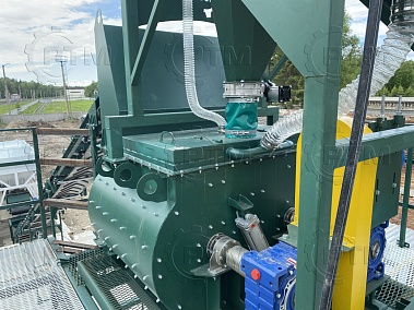 2. После набора нужного количества материалов инертные попадают в одновальный бетоносмеситель.